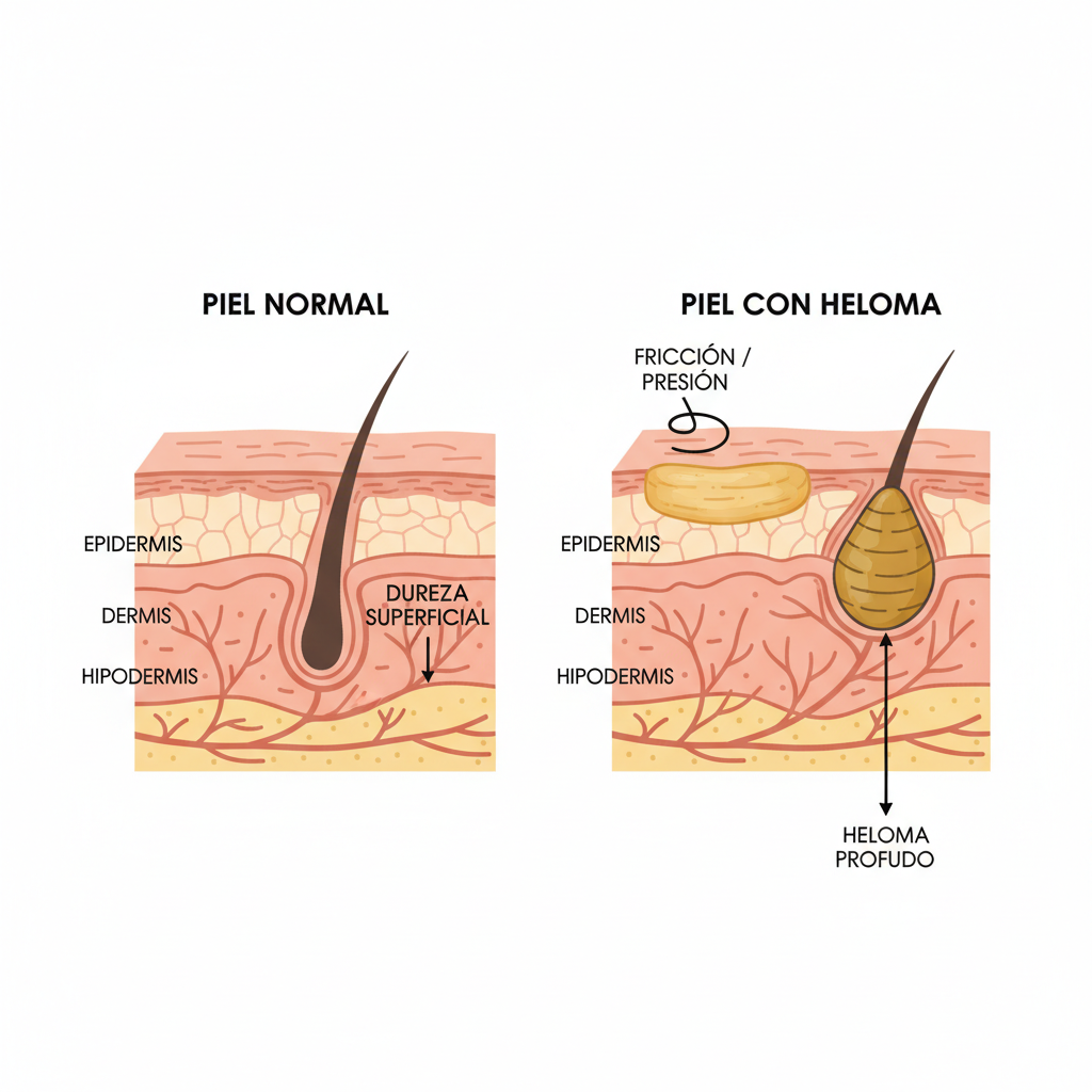 Los helomas son un engrosamiento localizado de la piel (hiperqueratosis) que se caracteriza por tener bordes bien definidos y por crecer hacia capas más profundas de la dermis. Esta es precisamente la diferencia fundamental con las durezas comunes, que son más superficiales y extensas.