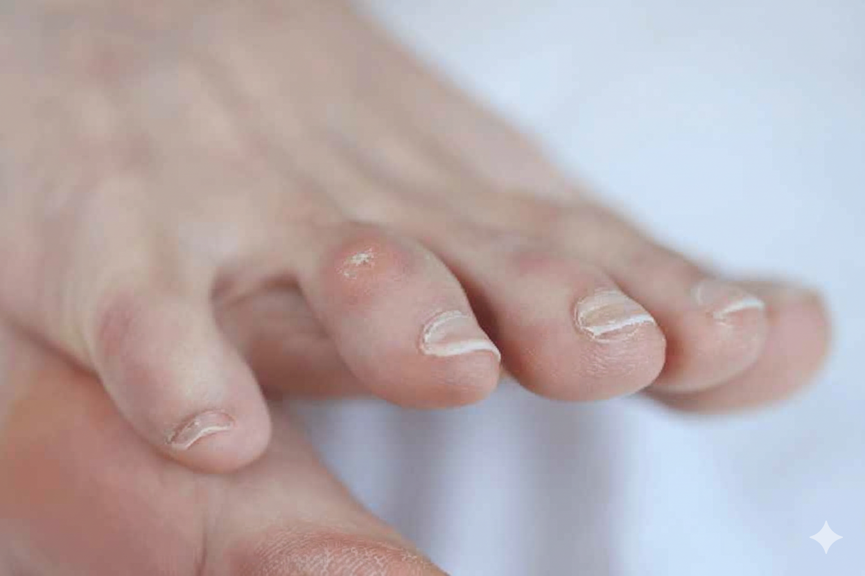 - Heloma de fondo de saco: Molestia en el pliegue entre los dedos, especialmente con calzado ajustado