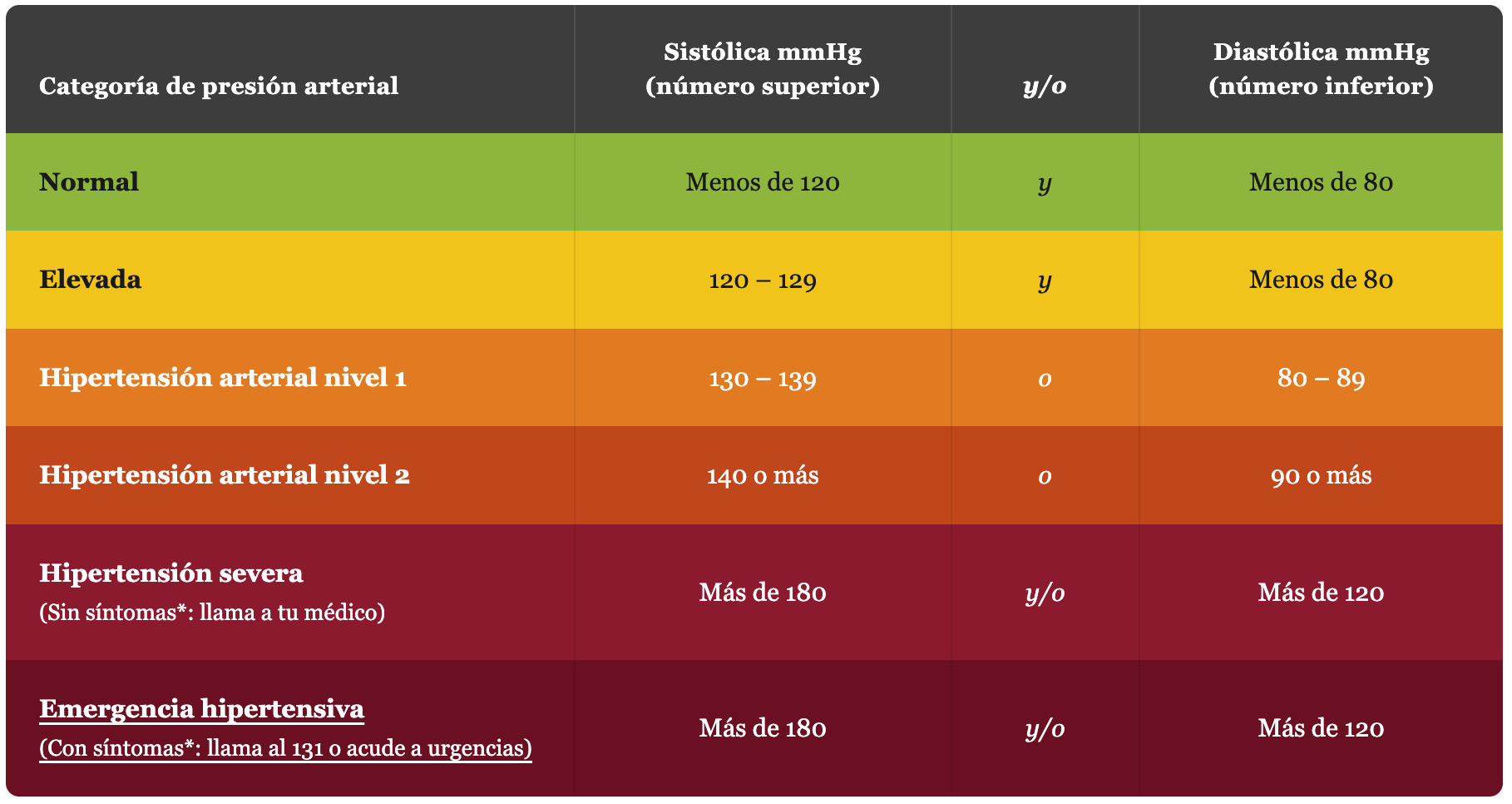 La siguiente tabla refleja la clasificación oficial basada en las guías de la American Heart Association. Recuerda que un solo registro no define tu estado de salud: lo que importa es el patrón observado a lo largo del tiempo con mediciones consistentes.